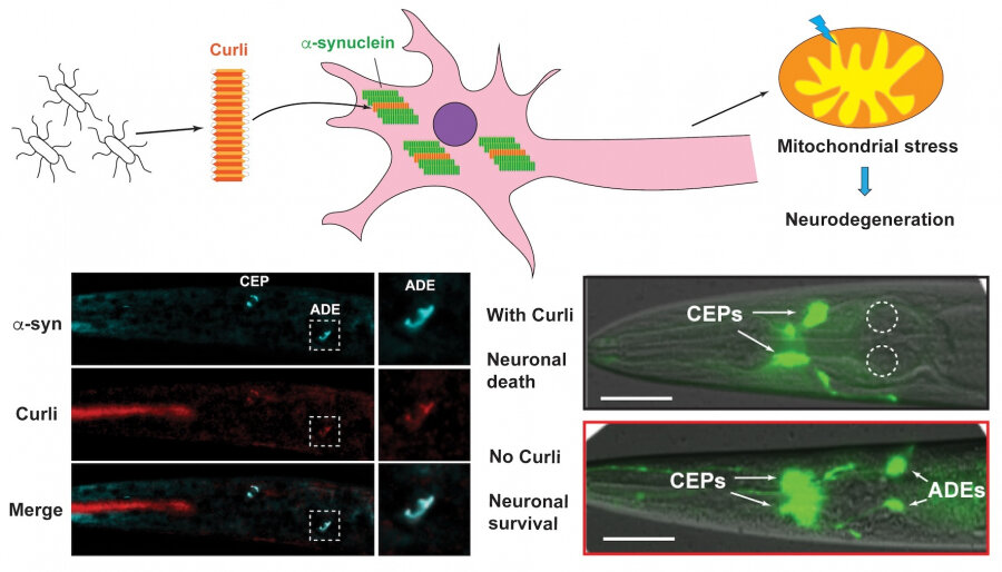 (Alzheimer-Immagine: i curli batterici promuovono l’aggregazione dell’α-sinucleina che porta allo stress mitocondriale e alla neurodegenerazione. Credito: Università di Hong Kong).