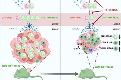 “I neutrofili immunosoppressori patologicamente attivati compromettono l’efficacia dell’immunoterapia antitumorale. Il recettore delle chemiochine CXCR4, un regolatore centrale dell’ematopoiesi e della biologia dei neutrofili, rappresenta un bersaglio interessante. In questo studio, abbiamo fuso un agonista parziale secreto di CXCR4, il fattore trefoil 2 (TFF2), con l’albumina sierica di topo (MSA) e abbiamo dimostrato che il peptide TFF2-MSA agisce in sinergia con l’anti-PD-1 per inibire la crescita del tumore primario e le metastasi a distanza e prolungare la sopravvivenza nei modelli murini di cancro gastrico (GC). Utilizzando topi transgenici per istidina decarbossilasi ( Hdc )-GFP per tracciare in vivo le cellule soppressorie derivate da mieloidi polimorfonucleate (PMN-MDSC) , abbiamo scoperto che TFF2-MSA riduce selettivamente i neutrofili immunosoppressori elevati di Hdc -GFP + CXCR4 , potenziando così l’uccisione tumorale mediata dalle cellule T CD8 + con l’anti-PD-1. È importante sottolineare che TFF2-MSA riduce la granulopoiesi midollare, a differenza dell’antagonismo CXCR4 che non conferisce benefici terapeutici. Nei pazienti con GC, livelli elevati di CXCR4 + LOX-1 + neutrofili a bassa densità sono correlati a livelli circolanti di TFF2 inferiori. Nel complesso, i nostri studi introducono una strategia che utilizza l’agonismo parziale di CXCR4 per ripristinare la sensibilità anti-PD-1 prendendo di mira i neutrofili immunosoppressori e la granulopoiesi”.