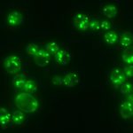 Immagine: batteri (verde) all’interno delle cellule tumorali del pancreas umano (cellule AsPC-1). I nuclei delle cellule sono blu mentre il loro citoplasma è macchiato di arancio. Credito: Weizmann Institute of Science.