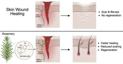 Le ferite cutanee dei mammiferi guariscono tipicamente con una cicatrice, caratterizzata da tessuto fibrotico che altera l’architettura e la funzione del tessuto originale. Le terapie che limitano la fibrosi e promuovono la guarigione rigenerativa rimangono un’importante esigenza clinica insoddisfatta. L’estratto di rosmarino, in particolare sotto forma di oli e creme per uso topico, ha attirato l’attenzione del pubblico per le sue presunte proprietà cicatrizzanti. Tuttavia, la sua efficacia e il suo meccanismo d’azione rimangono poco compresi. Dimostriamo in modelli murini adulti di guarigione delle ferite che un estratto di rosmarino a base di etanolo accelera la velocità di guarigione delle ferite e mitiga la fibrosi. Meccanicisticamente, identifichiamo che l’acido carnosico, un importante componente bioattivo delle foglie di rosmarino, attiva il nocicettore TRPA1 sui neuroni sensoriali cutanei per migliorare la rigenerazione tissutale. I topi privi di TRPA1 nei neuroni sensoriali non mostrano queste risposte pro-rigenerative, confermando il suo ruolo di mediatore critico. Insieme, questi risultati suggeriscono che l’estratto topico di rosmarino può rappresentare un approccio terapeutico efficace e accessibile per migliorare i risultati della riparazione cutanea”.