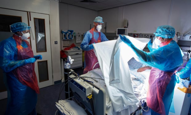 (COVID 19- Paziente con coronavirus ventilato: i medici sperano che la terapia con anticorpi possa essere somministrata ai pazienti ricoverati. Fotografia: Murdo MacLeod / The Guardian).