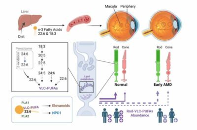 Lo studio mostra che l’AMD diminuisce i livelli di acido docosaesaenoico retinico periferico (DHA) nei bastoncelli dei fotorecettori, limitando l’allungamento degli acidi grassi per formare acidi grassi polinsaturi a catena molto lunga (VLC-PUFA). I VLC-PUFA sono precursori degli elovanoidi, messaggeri chimici bioattivi costituiti da acidi grassi polinsaturi a catena molto lunga omega-3.