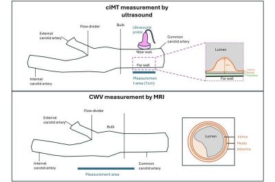 Grasso viscerale-immagine: panoramica schematica della misurazione dello spessore intima-media carotideo (cIMT) mediante ultrasuoni (in alto) e della misurazione del volume della parete carotidea (CWV) mediante risonanza magnetica (RM; in basso). Crediti: Communications Medicine