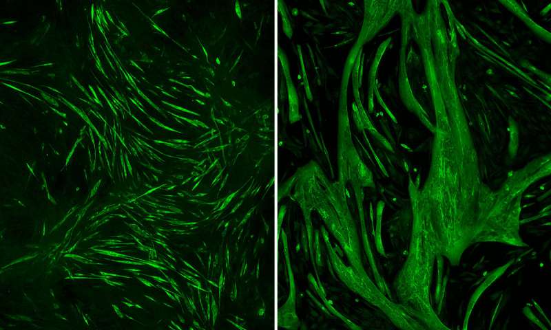 Immagine, la rimozione di un gene ha causato il normale aumento delle fibre muscolari (a sinistra) fino a tre volte la loro dimensione normale (a destra). I ricercatori della Scuola di Medicina dell’Università di Washington a St. Louis hanno scoperto che il target di una proteina correlata a quel gene con il litio può ridurre il deperimento muscolare in una rara forma di distrofia muscolare. Credito: Andrew Findlay.