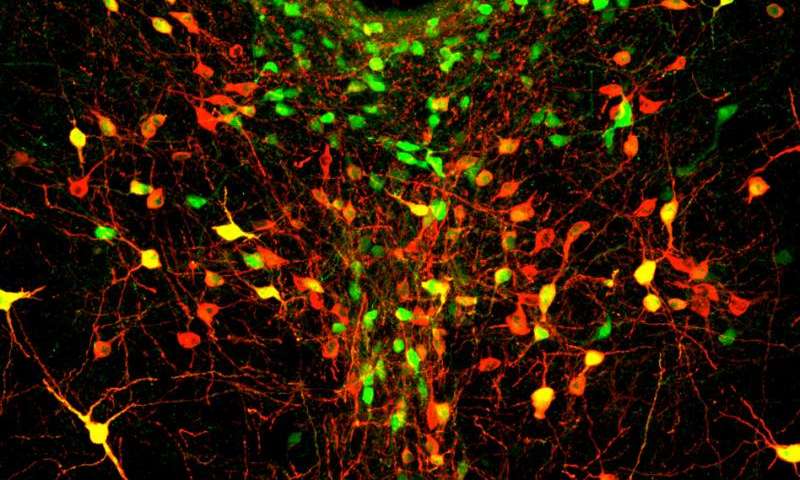 Immagine: nucleo dorsale del rafe e neuroni dopaminergici etichettati in verde e rosso.Credit: Gillian Matthews