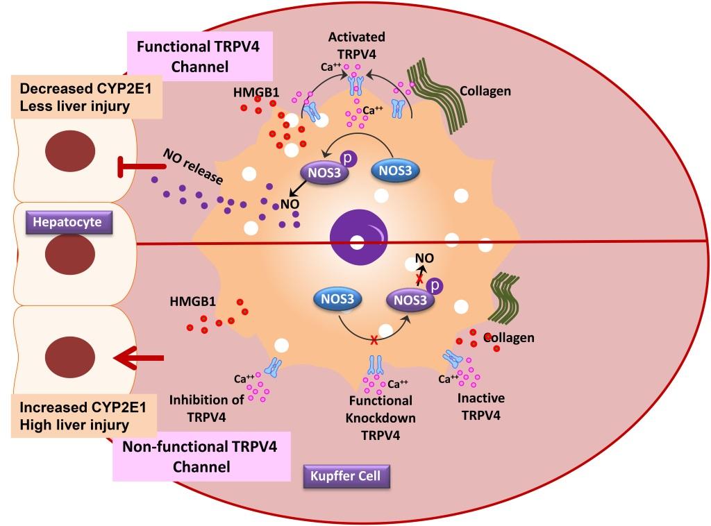 Imagine: l’ossido nitrico liberato da TRPV4 a sua volta blocca l’enziam CYP2E1 e previene il danno epatico nella steatosi epatica non-alcolica. Credit: University of South Carolina