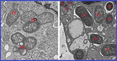 Malattia di Crohn-immagine: le micrografie elettroniche mostrano come i macrofagi che esprimono la girdina neutralizzino i patogeni fondendo i fagosomi (P) con i lisosomi cellulari (L) per formare i fagolisosomi (PL), compartimenti in cui i patogeni e i detriti cellulari vengono degradati (sinistra). Questo processo è cruciale per il mantenimento dell’omeostasi cellulare. In assenza di girdina, questa fusione fallisce, consentendo ai patogeni di eludere la degradazione e la neutralizzazione (destra). Credito: UC San Diego Health Sciences.