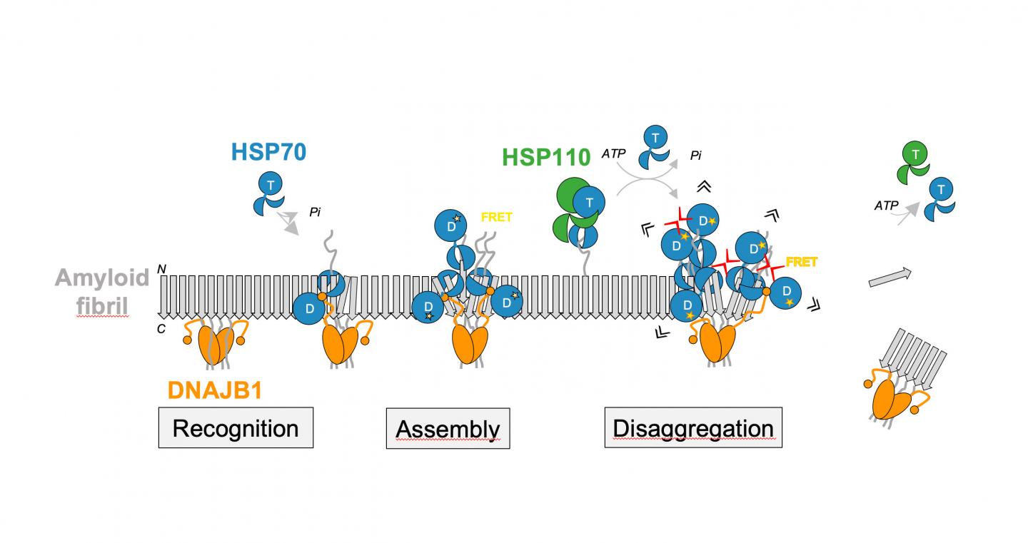 Immagine:la disaggregazione delle fibrille amiloidi dell’α-sinucleina si basa sulla collaborazione del chaperone HSP70 con i co-chaperoni DNAJB1 e HSP110. Questa collaborazione garantisce il riconoscimento delle fibrille, seguito dal corretto assemblaggio del macchinario di disaggregasi Hsp70 sulla superficie delle fibrille consentendo così una disaggregazione produttiva. Credit: Bernd Bukau / Università di Heidelberg.