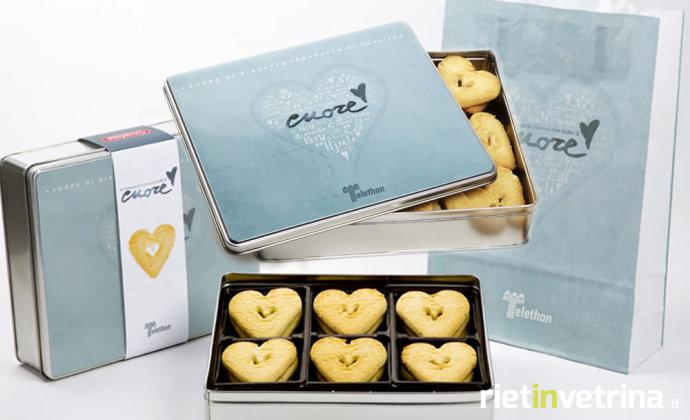 I “Cuori di biscotto” sono prodotti da una pasticceria genovese, un’azienda familiare che lavora da più di cento anni. Ogni scatola contiene 18 canestrelli di pastafrolla al burro a forma di cuore e una bustina di zucchero a velo, per un peso complessivo di 300g. Ogni prodotto è realizzato senza aggiunta di conservanti, aromi o coloranti. I biscotti sono racchiusi in una scatola di latta, decorata da Annalisa Beghelli, pensata per essere riutilizzata e per poter continuare a vivere nelle case come elegante contenitore. “Io sostengo la ricerca con tutto il cuore” è il messaggio che si legge sulla confezione per ricordare l’importanza della generosità e della voglia di donare per sostenere la ricerca scientifica per la cura delle malattie genetiche rare.